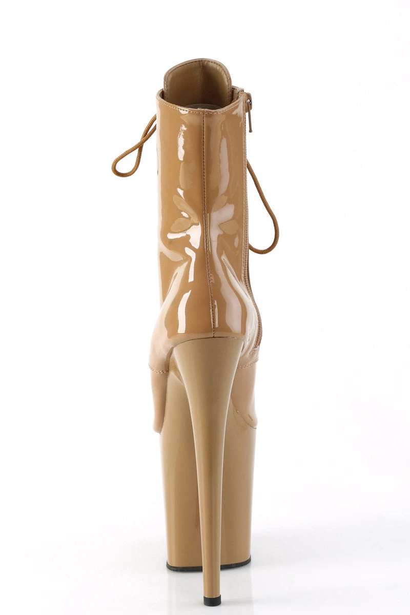 - Patent Toffee Platform, Peep Toe, Lace-Up Front Ankle Boot, Inside Zip Closure
